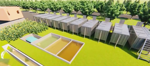 集裝箱式養(yǎng)殖系統采用 20 呎定制化“集裝箱”,尺寸是 6.1 米 *2.4 米 *2.8 米,養(yǎng)殖水體 25 立方米,占地面積為 15 平方米 ,配有納米增氧管(增氧)、出魚口(收魚)、集污槽(排污)、天窗(觀察投喂飼料)、固液分離器(尾水處理)等功能構件。